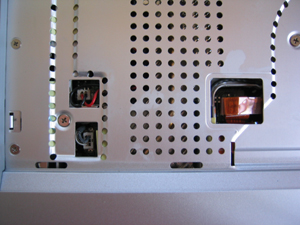 ハードディスクは2本のビスで固定されているので交換は簡単。左右のハードディスク固定金具を外して終了。