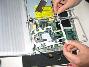 ロジックボード上のフレームの取り外し。ビスの長さの違いに注意。