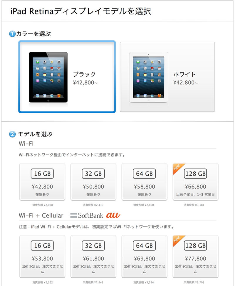 Apple Online Storeは、本日よりiPad 4th 128GBモデルの販売を開始した。
