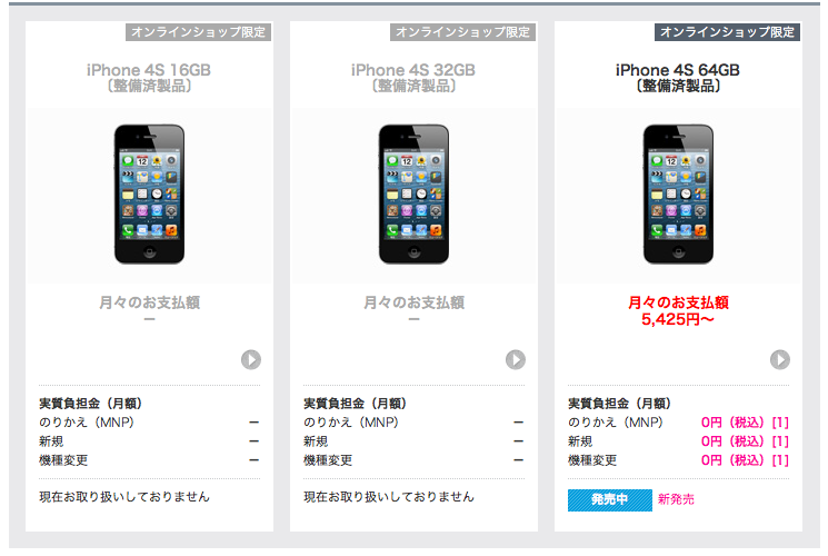 現在、ソフトバンクオンラインショップで販売されている製品は、iPhone 4S 64GBモデルの整備済製品で、端末代は28,800円で、24回の分割払いだと月あたり1,200円となる。