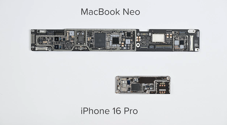 iPhone 16 Proの基板と比較されたMacBook Neoのものは、もはやMacはもうこのサイズに収まったのかと‥。