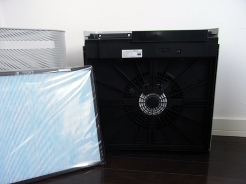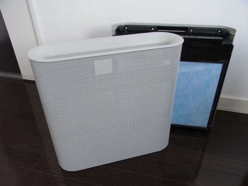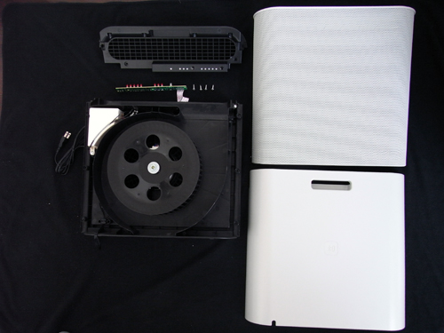 家電製品とあって、Air Purifierはユーザが簡単にバラせる、いや、フィルターを交換できる構造となっている。工具不要、フロントパネルを取り外すと空気清浄機の要のHEPAフィルターがあった。