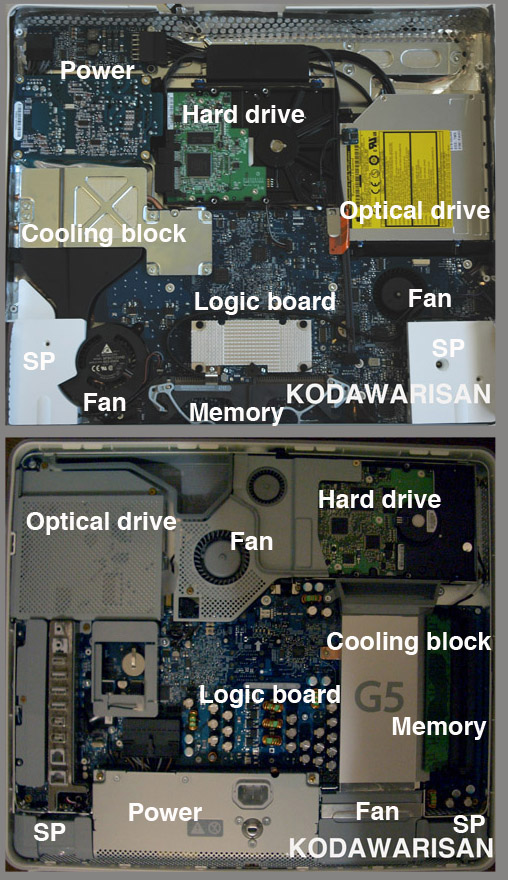 新iMac G5 は、旧iMac G5で発生した熱によるトラブルや冷却ファンの騒音対策を優先して改良、各パーツの配置を再デザインしたまったく新しいモデルだ。