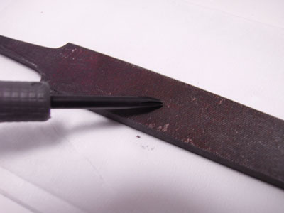 ![]() 今回使用したアイテムは、SUNFLAG 特殊精密ドライバー五角小 ![]() 特殊ドライバーは、そのままではサイズが大きいため、ヤスリで角を削りながら、 ![]() ネジ滑り止め液をネジに軽く流し込み、加工した特殊ドライバーで押し付けながら、ゆっくりと慎重に取り外す。ネジ滑り止め液がジャリジャリと音を立てながらビスが回っていくのがわかる。ただし、ネジはロックタイトで固定されているので、最初はかなり力が必要であるが、力の入れ過ぎは禁物だ。後で後悔することになる。 ![]() その後悔とは、左右の画像を見比べるとわかるが、ドライバーの先がぴったりと合っていると思われたが、ビスのヘッド部分が非常に柔らかく、取り外し前後で花形の形状が若干崩れてしまった(画像右)。ただし、一度取りは外してしまうと、ロックタイトが効かなくなるので、以後は力を加えず簡単にビスを外すことができる。