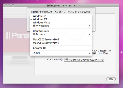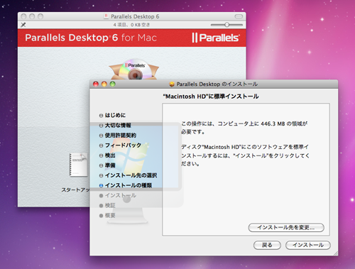 インストラーの指示どおり、 Parallels Desktop 6 for Macをインストール。今回は、Windows XP を仮想ドライブとして設定した。