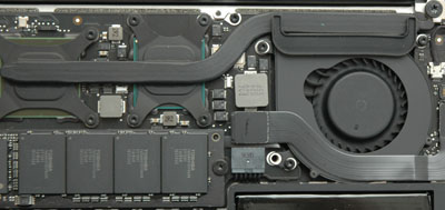 MacBook Airは、ハードディスクが搭載されなくなったので発熱量が減ったと言えども、プロセッサからかなりの発熱し、筐体内にたまる。この熱は、この冷却ファンで強制排気されるのだが、非常に薄いシロッコファンなので吐き出される熱も限界がある。さて、どのようにして MacBook Air内部が冷却されているのだろうか。