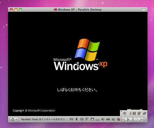 Macのウィンドウ上に、Windows XP のロゴが表示された。ここまで、インストールに要した時間は、十数分とストレスなく終わった。