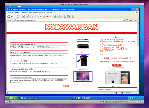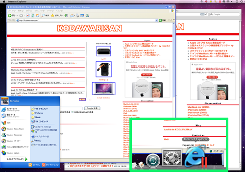 Coherence モードは、 Windows アプリケーションと Mac アプリケーションを、両 OS が 1 つに統合されたかのように同時に実行されるのだ。画像のように、Windows XP で動作する Internet Explorer のアイコンが Dock に表示され、起動しているのだ。もちろん他のアプリも同様に起動するので、Windows 専用アプリケーションであることを忘れてしまう。